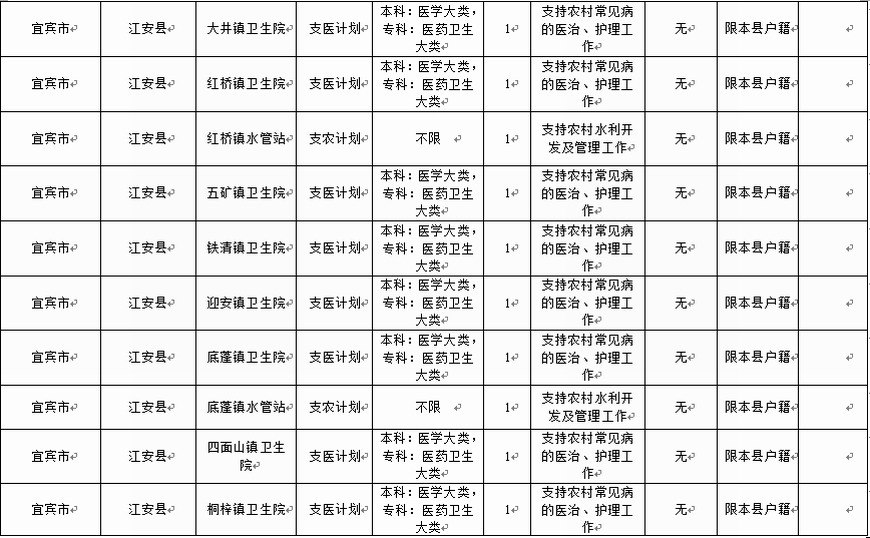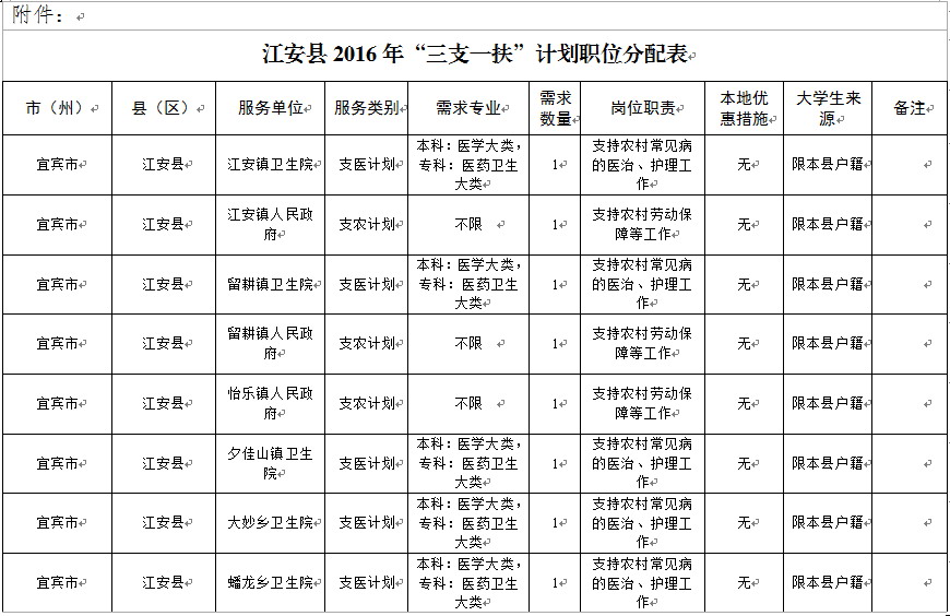具體崗位要求見(jiàn)《江安縣2016年“三支一扶”計(jì)劃職位表》(附件)。