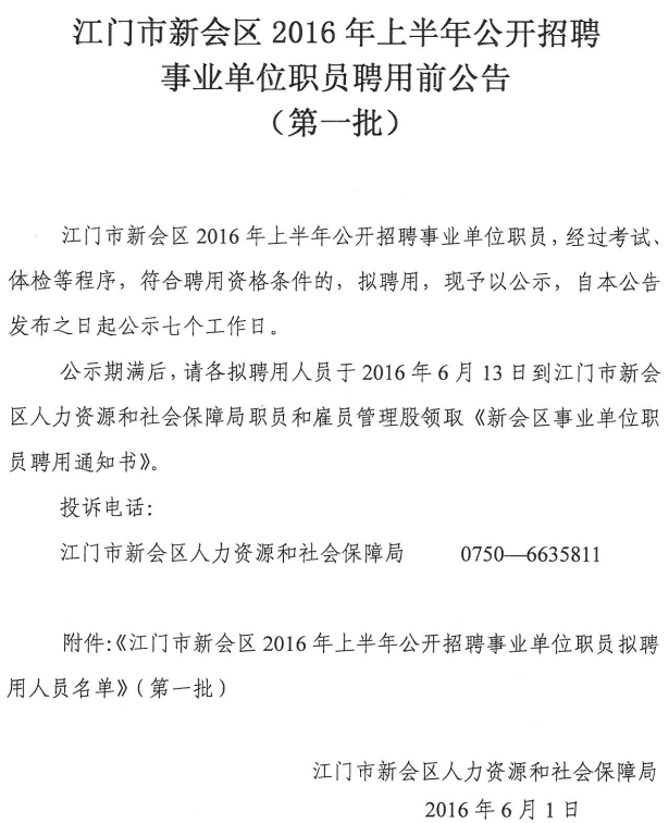 2016上半年廣東江門市新會區(qū)招聘事業(yè)單位職員聘前公告(第一批)