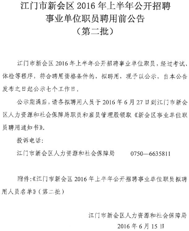 2016上半年廣東江門(mén)市新會(huì)區(qū)招聘事業(yè)單位職員聘前公告(第二批)