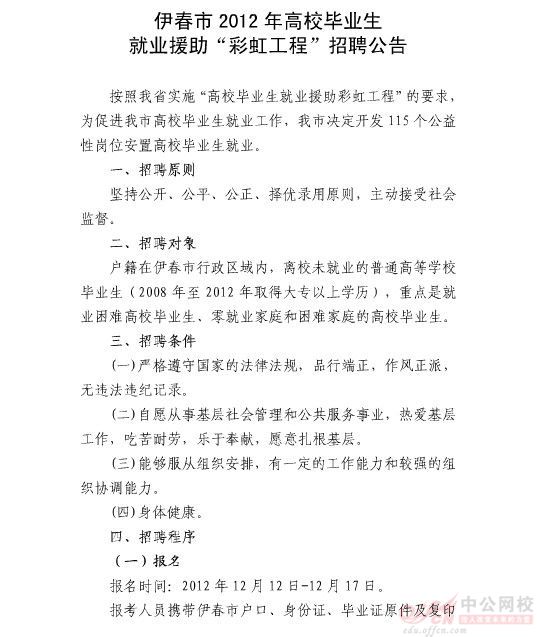 黑龍江事業(yè)單位:伊春市高校畢業(yè)生就業(yè)援助“彩虹工程”招聘人員公告【招115名】