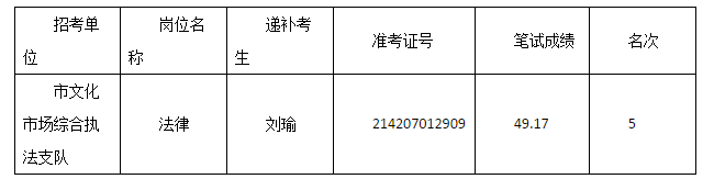 鄂州市文體新廣系統(tǒng)2016年事業(yè)單位公開招聘資格復(fù)審,因市文化市場(chǎng)綜合執(zhí)法支隊(duì)法律崗位第2名考生劉家麟放棄資格復(fù)審,根據(jù)《鄂州市事業(yè)單位2016年度公開招聘工作人員公告》有關(guān)規(guī)定,在報(bào)考同一崗位考生中按照筆試成績(jī)從到低分依次遞補(bǔ)的原則,遞補(bǔ)以下考生為資格復(fù)審人選: