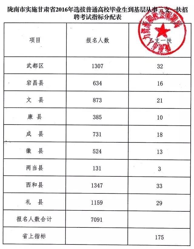 根據《關于隴南市實施甘肅省2016年選拔普通高校畢業(yè)生到基層從事三支一扶工作指標分配的通知》(隴人社發(fā)〔2016〕175號)文件精神,根據省上按報名人數分配的做法,把省上下達我市的指標,按照各縣區(qū)報名人數進行分配,具體見下表。