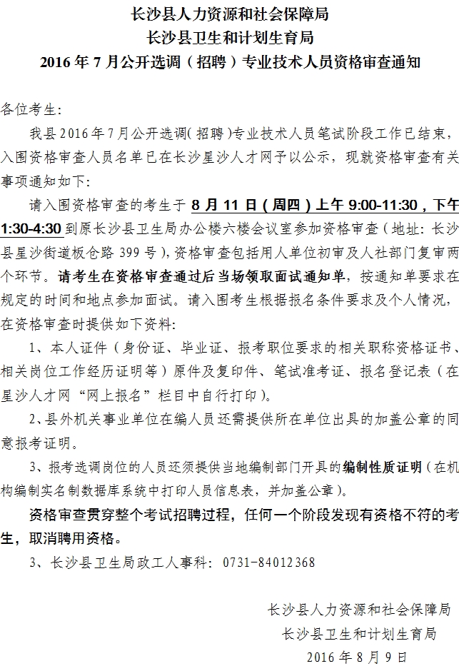 原標題:2016年7月公開選調(diào)(招聘)專業(yè)技術(shù)人員資格審查通知