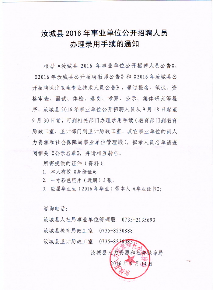 原標(biāo)題:汝城縣2016年事業(yè)單位公開招聘人員辦理錄用手續(xù)的通知