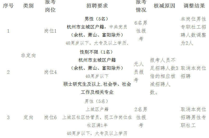 根據(jù)《上城區(qū)2016年度專(zhuān)職社區(qū)工作者招聘公告》關(guān)于“各招聘崗位報(bào)考人員不足招聘人數(shù)3倍的相應(yīng)核減招聘人數(shù)”的規(guī)定。調(diào)整后的招聘人數(shù)分別為: