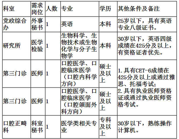 昆明醫(yī)科大學(xué)附屬口腔醫(yī)院(云南省口腔醫(yī)院)是云南省規(guī)模、設(shè)備、技術(shù)力量最雄厚的三級(jí)口腔專(zhuān)科醫(yī)院,因醫(yī)療業(yè)務(wù)發(fā)展需要,特向社會(huì)誠(chéng)聘工作人員,現(xiàn)將有關(guān)事項(xiàng)告示如下: