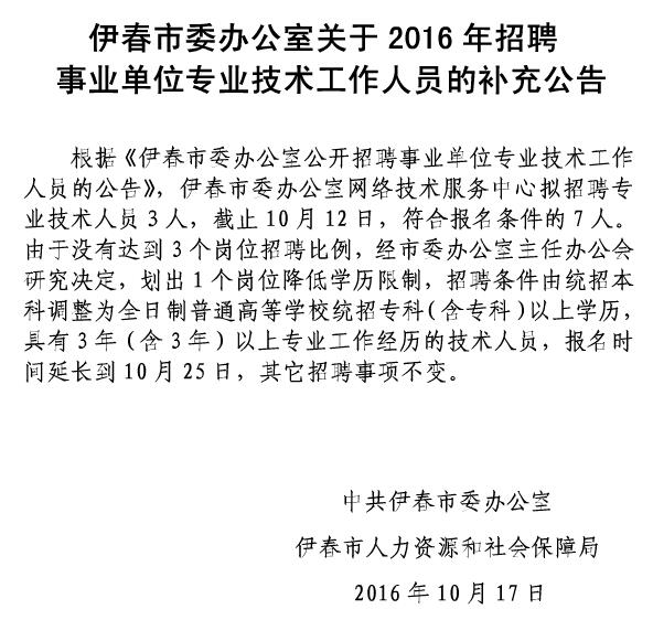 原標(biāo)題:伊春市委辦公室關(guān)于2016年招聘事業(yè)單位專業(yè)技術(shù)工作人員的補充公告