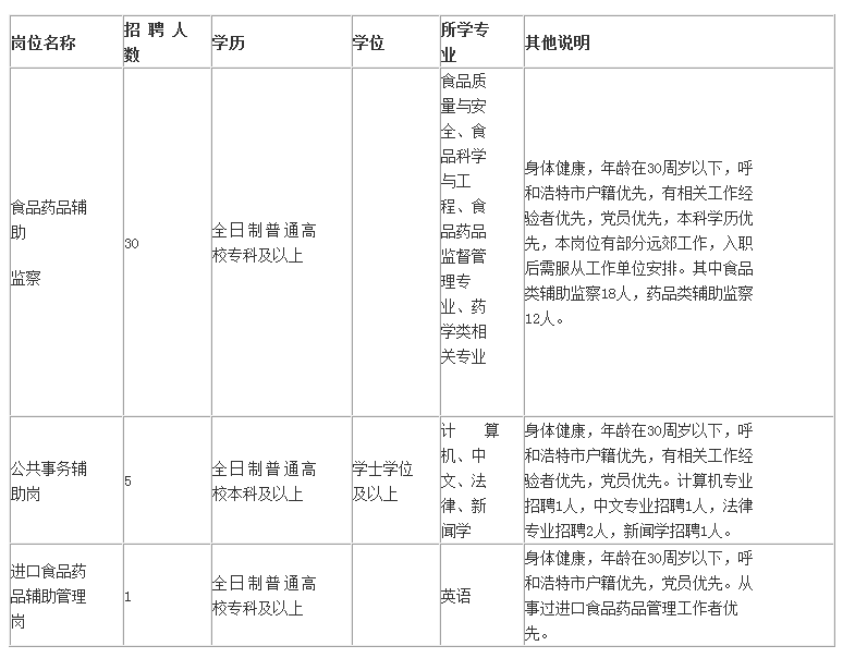 為公眾飲食用藥安全水平,更好的服務于食品醫(yī)藥經濟平穩(wěn)較快發(fā)展,呼和浩特市賽罕區(qū)食品藥品監(jiān)督局全權委托內蒙古聚英人力資源服務中心擬招聘36名勞務派遣人員,具體事宜如下: