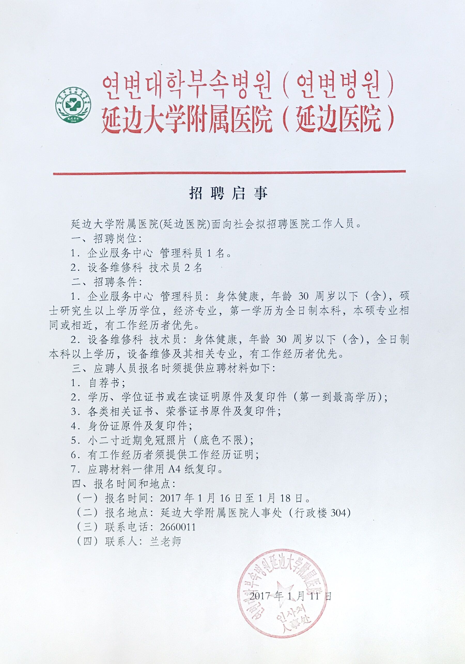 2017吉林省延邊大學(xué)附屬醫(yī)院(延邊醫(yī)院)招聘工作人員公告【招3人】