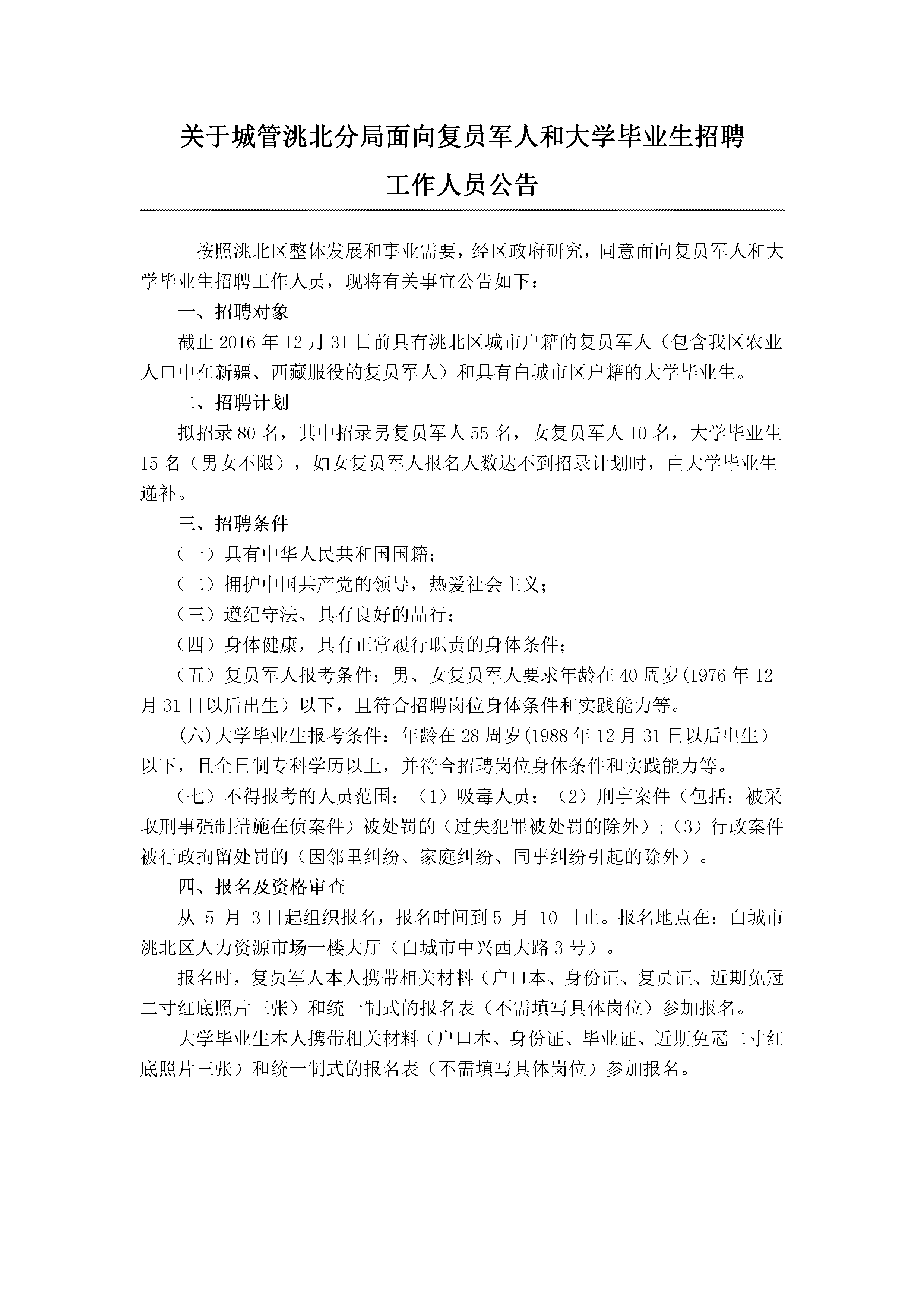 2017年白城市城管洮北分局面向社會招聘工作人員公告【招80人】