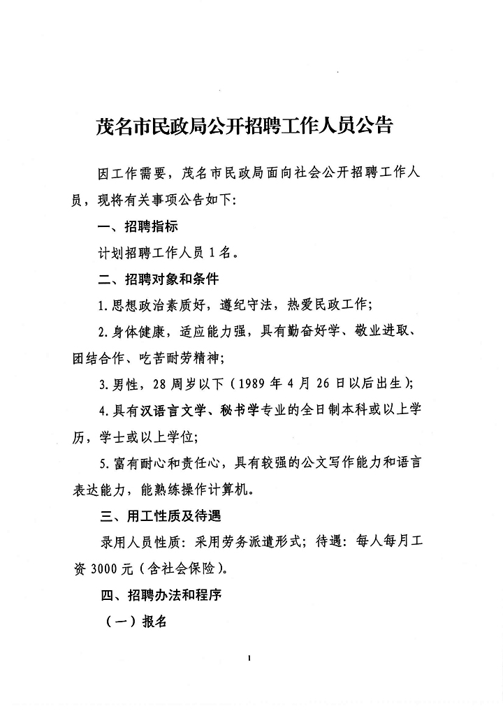 茂名市民政局公開招聘工作人員公告