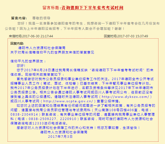 近日,德陽局長信箱回復德陽考生:下半年暫無事業(yè)單位招考計劃。我市2017年公務員招錄計劃在下半年進行。詳情如下: