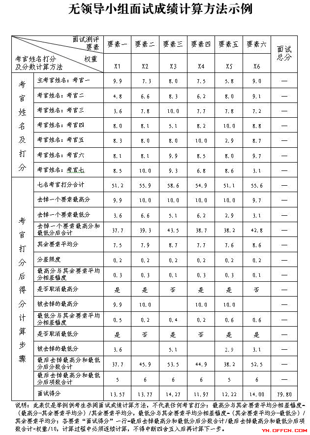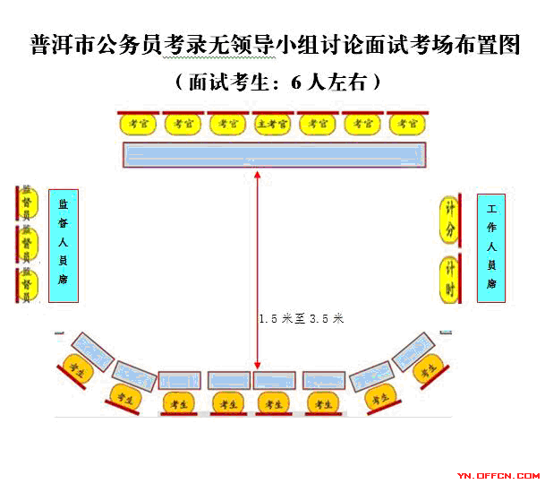 (3)每個面試考場人員安排為考官7人(主考官1人,其他考官6人,面試考場成立面試考官小組,主考官為面試考官小組組長),計分2人,引導員1人,人大監(jiān)督員1人,政協(xié)監(jiān)督員1人,考生一般每個考場每輪8人左右。
