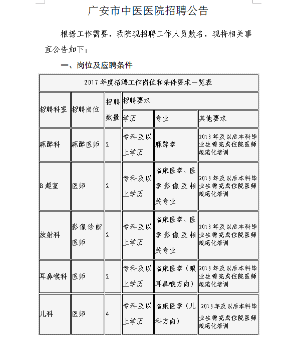 2017四川廣安市中醫(yī)醫(yī)院招聘公告