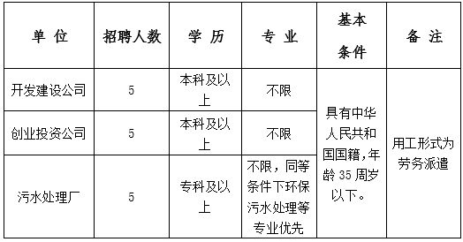 2、試用期滿合格,予以正式轉(zhuǎn)正;試用期滿不合格,予以退回勞務派遣公司。轉(zhuǎn)正后薪酬按照企業(yè)相關(guān)標準執(zhí)行:污水處理廠3000元/月起;開發(fā)建設(shè)公司和創(chuàng)業(yè)投資公司3800元/月起。