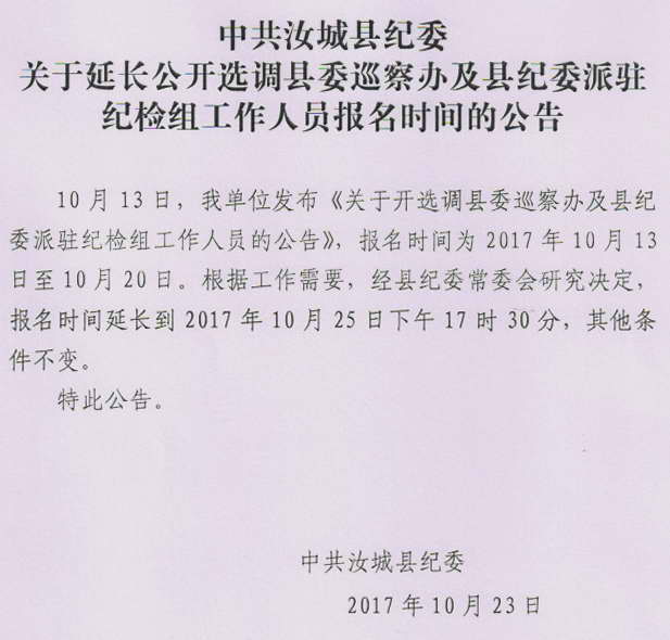 2017湖南汝城縣委巡察辦及縣紀(jì)委派駐紀(jì)檢組選調(diào)報(bào)名時(shí)間延長通知
