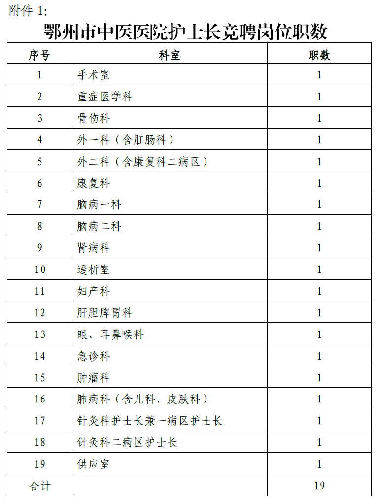 1.本次全院擬設(shè)護(hù)士長(zhǎng)崗位19個(gè)(詳見附件1)。