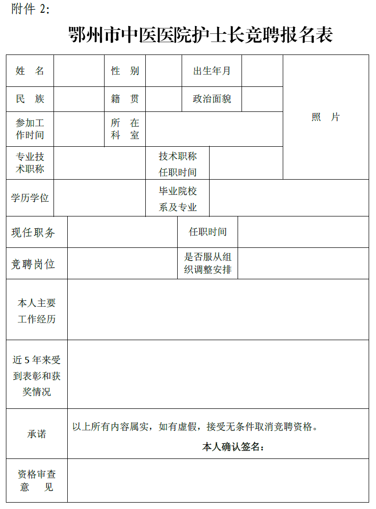 1.公開職數(shù)、個(gè)人報(bào)名。在醫(yī)院網(wǎng)站、微信公眾號(hào)、職工QQ群等媒體平臺(tái)發(fā)布競(jìng)聘公告。根據(jù)公布的崗位職數(shù)和崗位條件,個(gè)人自愿填寫《護(hù)士長(zhǎng)競(jìng)聘報(bào)名表》(見附件2)。