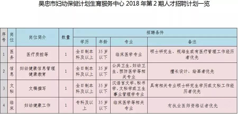 我中心2018年第2期公開招聘備案編制人員4名,具體招聘崗位、人數(shù)詳見《吳忠市婦幼保健計劃生育服務中心2018年第2期人才招聘計劃一覽表》