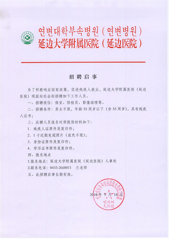 本文章轉(zhuǎn)自延邊大學(xué)附屬醫(yī)院官方網(wǎng)站,原標(biāo)題為:招聘啟事1