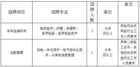 因業(yè)務(wù)發(fā)展需要,嘉興市中心血站決定公開(kāi)招聘編外合同制人員4名,現(xiàn)將公開(kāi)招聘有關(guān)事項(xiàng)公告如下: