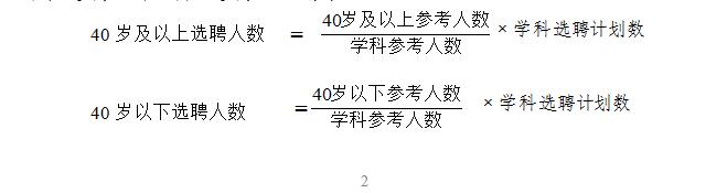 報考中小學(xué)教師的按考試、考核總成績從高到低選聘(總成績?yōu)槲幕荚嚦煽?0%的折后分加上考核分)。選聘計劃為1人的不分年齡段錄聘;選聘名額在1人以上的,按年齡段(40歲及以上和以下,以1979年7月31日為界)分學(xué)科按比例選聘,具體選聘公式為: