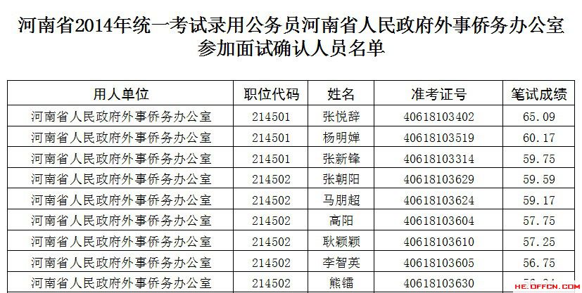 根據(jù)省委組織部、省人力資源和社會廳、省公務(wù)員局2014年統(tǒng)一考試錄用公務(wù)員工作有關(guān)規(guī)定,現(xiàn)將河南省人民政府外事僑務(wù)辦公室面試資格確認有關(guān)事宜通知如下: