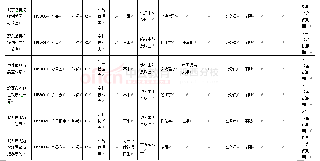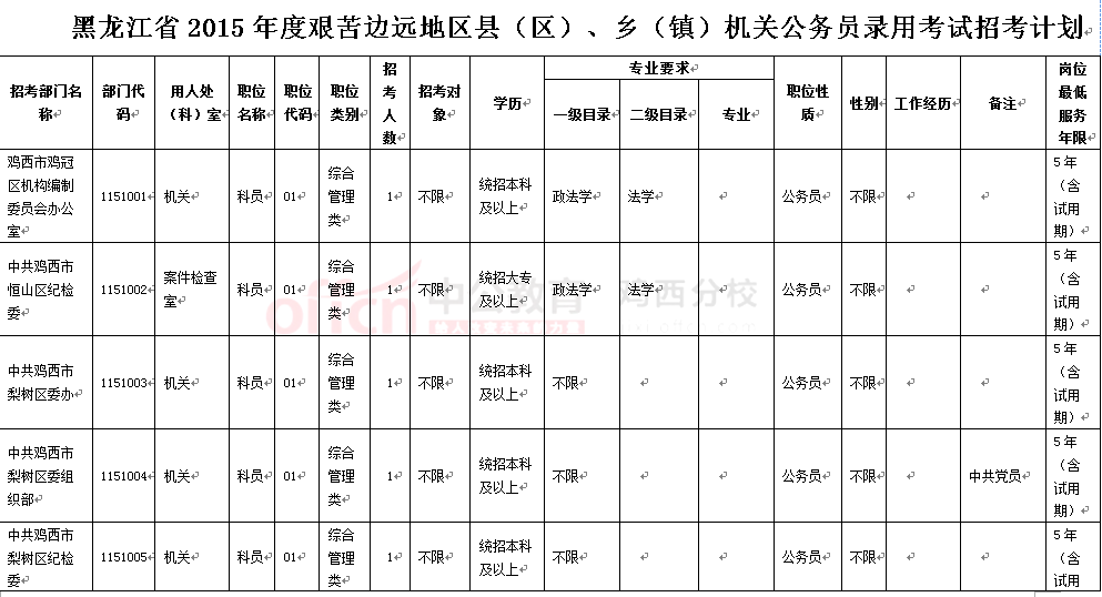2015年黑龍江省艱苦邊遠地區(qū)公務員考試招錄雞西地區(qū)職位表