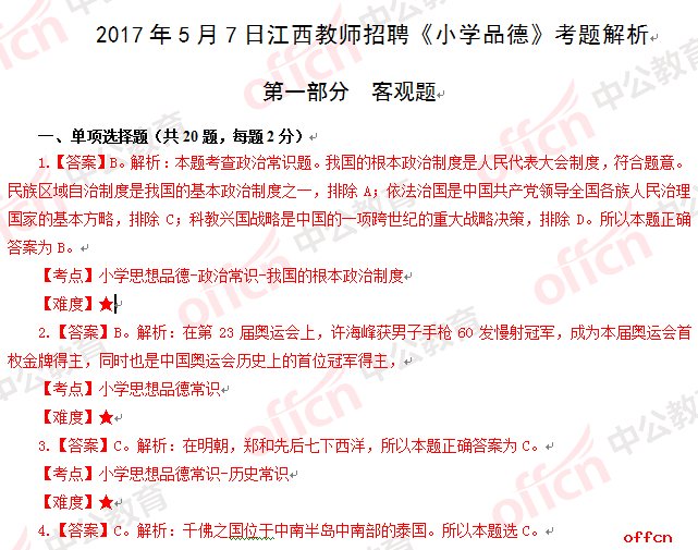 2017年江西教師招聘《小學(xué)品德》試題答案及解析